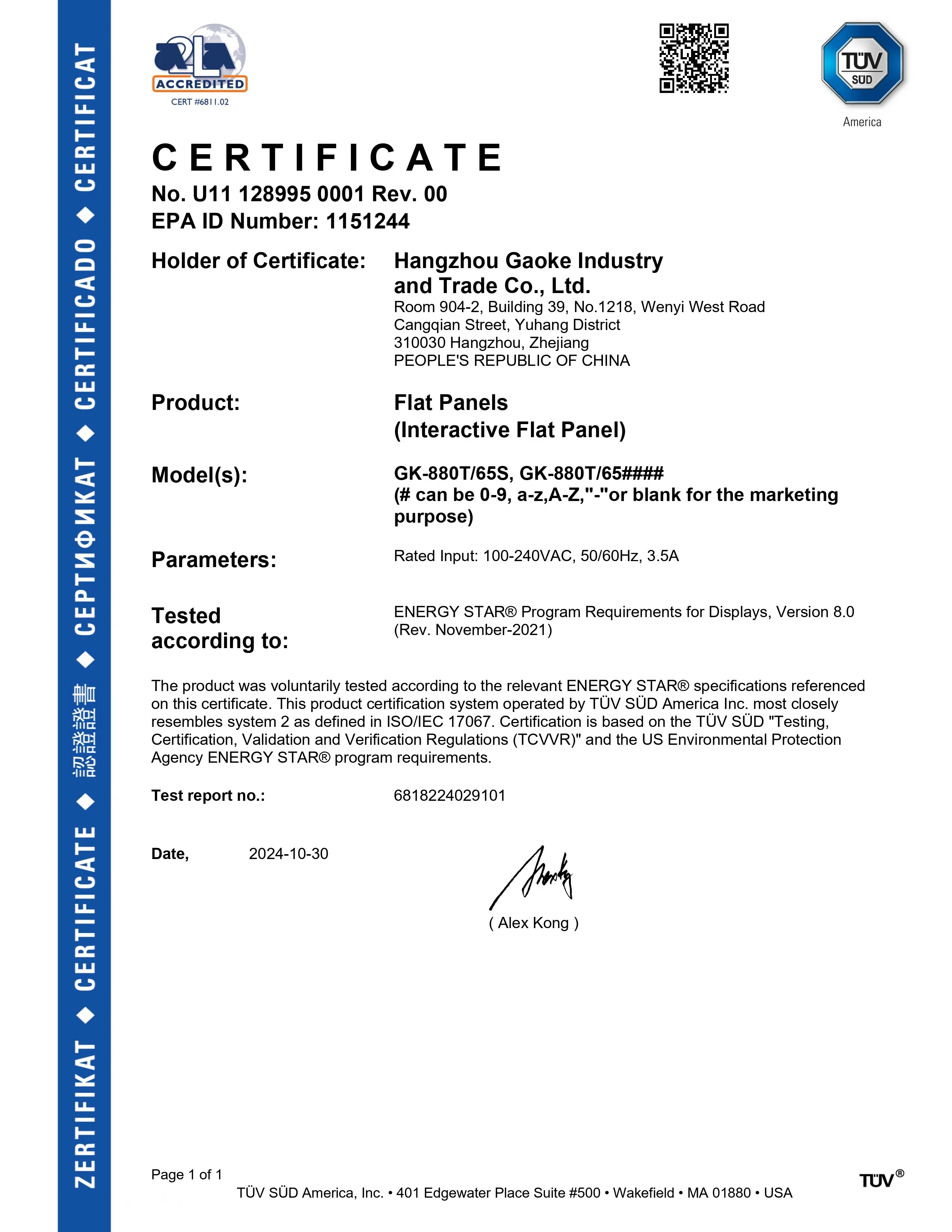 After years of persistent efforts contributed by the whole staff, now Gaoke has formed a comprehensive management system that integrates R&D, manufacturing domestic and international sales as well as solution design. Our factory covers an area of nearly 10,000 square meters.Our main products include interactive,whiteboard, interactive flat panel, interactive smart blackboard, document camera, digital signage kiosk etc. Besides, we are making great efforts to develop new products to meet different requirements.  In 2009 Gaoke has also established a branch company in Germany Munich.In addition, we have obtained, ISO9001, ISO14001, ISO 45001,C E, C B, R O H S, TÜV etc certificates.